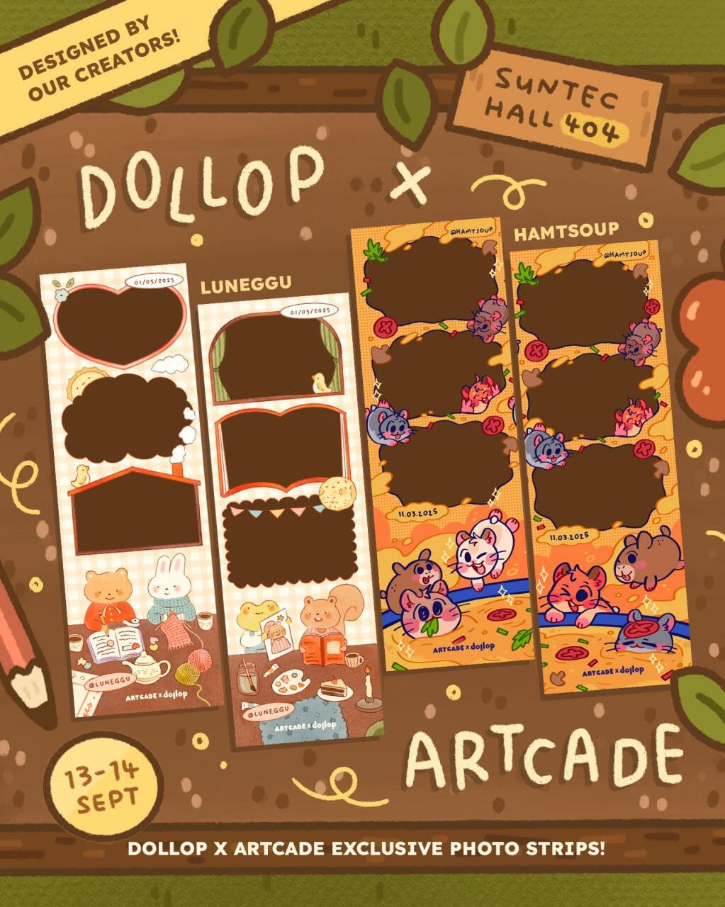 Designed a photostrip for artcades collaboration with dollop print club sg! I drew A mix of hamsters and capybaras chilling or jumping into a bowl of soup to represent both my brand "hamtsoup" and "artcadesg"